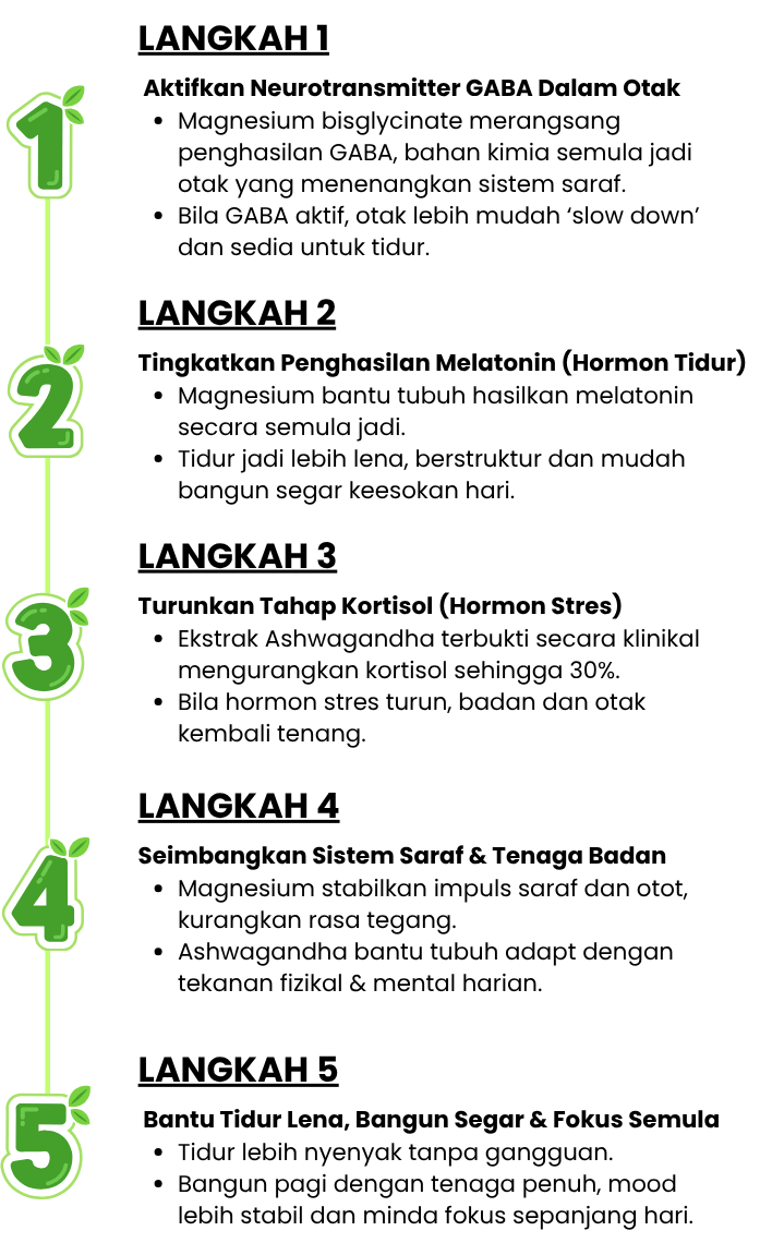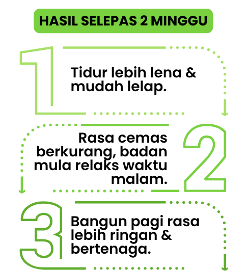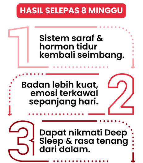 Sistem saraf & hormon tidur benar-benar stabil. Tidur nyenyak tanpa gangguan, bangun segar & tenang setiap pagi. Inilah tahap “reset semula” yang dicapai bila konsisten 2 bulan.
